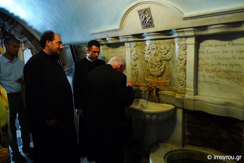 Εκ μέρους του κ. Δωροθέου Β’, τον Καρδινάλιο και τη συνοδεία του καλωσόρισε ο Αρχιερατικός Επίτροπος της ιεράς νήσου Τήνου, Πρωτοπρ. Γεώργιος Φανερός, ο οποίος τους ξενάγησε στον Ναό της Μεγαλόχαρης και στον Ναό της Ευρέσεως της αγίας Εικόνος, ενώ τους ευχήθηκε καλή δύναμη στο έργο τους.