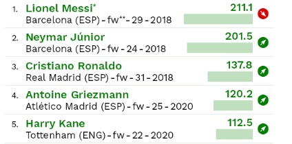 Ακριβότερος ποδοσφαιριστής του κόσμου με αξία 211,1 εκατ. Ευρώ παραμένει ο Λιονέλ Μέσι, με τον συμπαίκτη του στην Μπαρτσελόνα Νεϊμάρ Ζούνιορ να βρίσκεται στη δεύτερη θέση με 201,5 εκατ. ευρώ. Τρίτος με μεγάλη διαφορά ακολουθεί ο Κριστιάνο Ρονάλντο με 137,8 εκατ. ευρώ.
