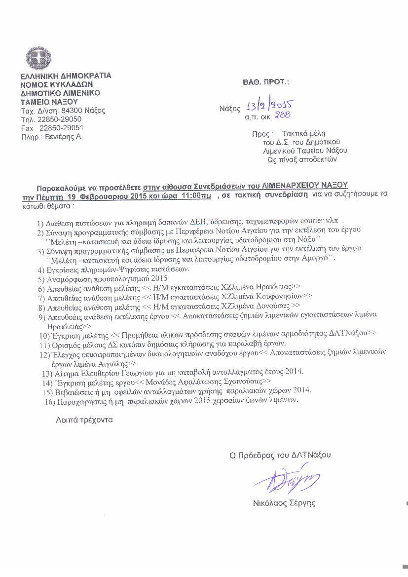 Η πρόσκληση για τη συνεδρίαση και τα θέματα της ημερησίας διάταξης: