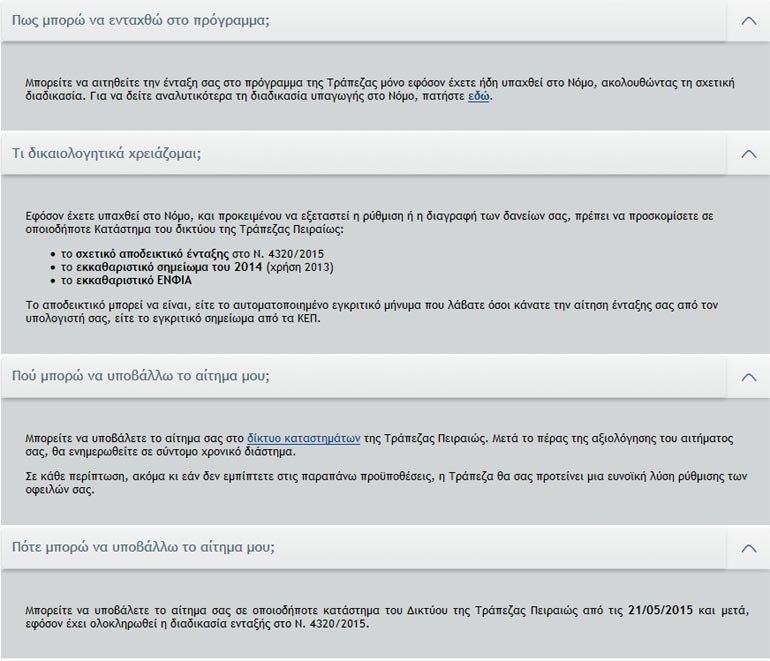 Στο πρόγραμμα αυτό της Τράπεζας Πειραιώς εντάσσονται οι δικαιούχοι του Νόμου 4320/2015, όσοι δηλαδή πληρούν τα σχετικά εισοδηματικά και περιουσιακά κριτήρια για την ένταξή τους στο Νόμο. Πληροφορίες για τους ενδιαφερόμενους θα δίδονται και από τα 803 καταστήματα της Τράπεζας Πειραιώς στην Ελλάδα και στην ηλεκτρονική διεύθυνση www.piraeusbank.gr.
