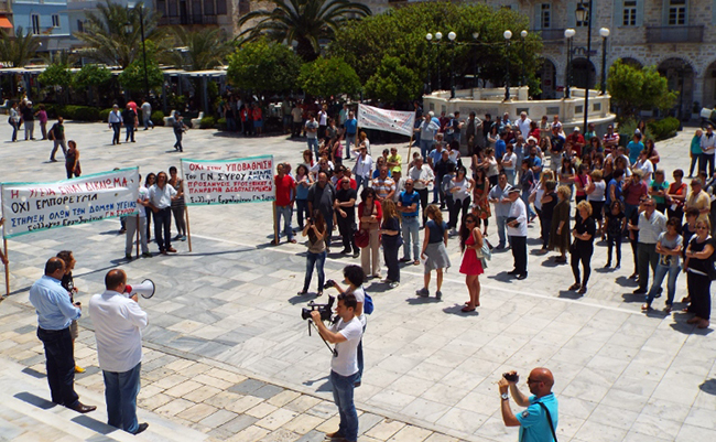 Η πορεία κατέληξε στην πλατεία Μιαούλη, όπου απόντος του δημάρχου Γιώργου Μαραγκού (βρίσκεται στη Νάξο για την συνεδρίαση του Συμβουλίου Ακτοπλοϊκών Συγκοινωνιών) μίλησε εκ μέρους του ο αντιδήμαρχος Αλέξης Αθανασίου, ο οποίος αναφέρθηκε και αυτός στις προσπάθειες του Δήμου για παροχή κινήτρων σε γιατρούς προκειμένου να έρθουν στο νοσοκομείο Σύρου.