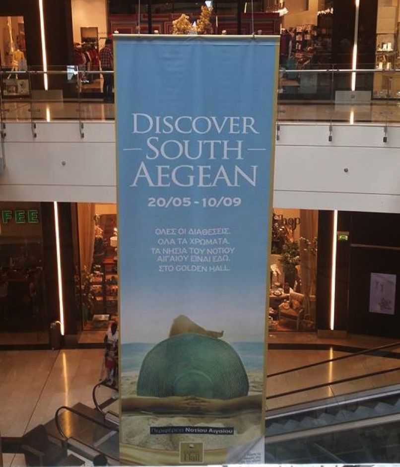 Η Περιφέρεια Νοτίου Αιγαίου και το Golden Hall, οργανώνουν τετράμηνη προβολή των 50 νησιών της περιοχής Κυκλάδων και Δωδεκανήσου, δίνοντας στον επισκέπτη του εμπορικού κέντρου τη δυνατότητα να γνωρίσει από κοντά όλα τα νησιά του Νοτίου Αιγαίου, τον πολιτισμό και την ιστορία τους.