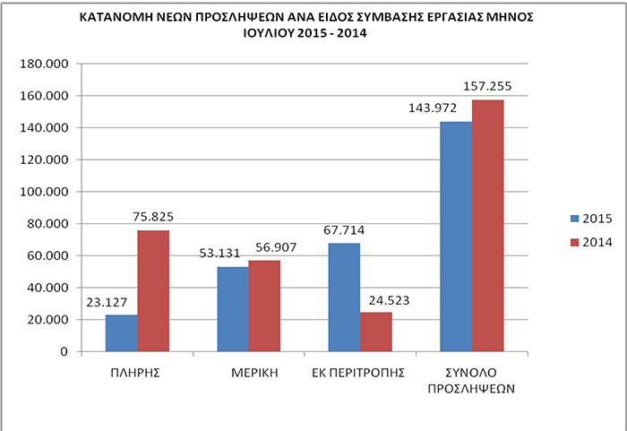 Πιο συγκεκριμένα τον Ιούλιο του 2015 από το σύνολο των προσλήψεων μόνο το 16,07{ebf2de1fdbfefdec110a02f4c927aa7ce558be84e5a322e6c41137cb467b3c6d} αφορά προσλήψεις πλήρους απασχόλησης, ενώ το υπόλοιπο αφορά εκ περιτροπής και μερική απασχόληση. Πέρυσι την ίδια περίοδο το ποσοστό πλήρους απασχόλησης ανέρχονταν σε 48,22{ebf2de1fdbfefdec110a02f4c927aa7ce558be84e5a322e6c41137cb467b3c6d}.
