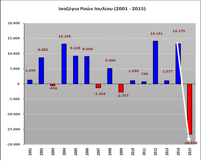 Πιο συγκεκριμένα τον μήνα Ιούλιο 2015 παρατηρείται η μεγαλύτερη μείωση στο ισοζύγιο των ροών μισθωτής απασχόλησης, καθώς χάθηκαν 16.658 θέσεις απασχόλησης, ενώ συγκριτικά με πέρυσι 29.933 θέσεις! Πρόκειται για τη χειρότερη επίδοση των τελευταίων 15 ετών.