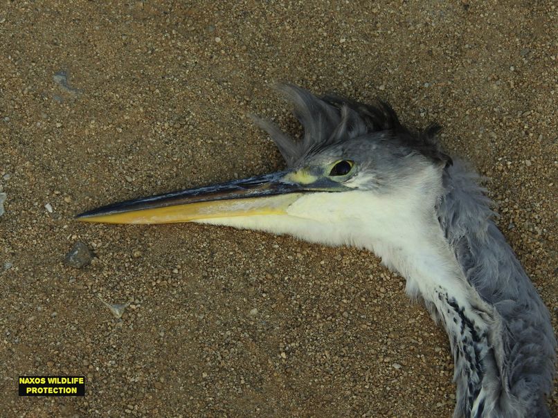 Άλλος ένας ερωδιός (Σταχτοτσικνιάς Ardea cinerea) θύμα των καλωδίων, της ΔΕΗ στην περιοχή της αλυκής του αεροδρομίου Νάξου.