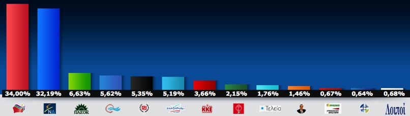 Ο ΣΥΡΙΖΑ αύξησε ελαφρά τα ποσοστά του σε σχέση με τις εκλογές του Ιανουαρίου 2015 που είχε λάβει 34,00{ebf2de1fdbfefdec110a02f4c927aa7ce558be84e5a322e6c41137cb467b3c6d} ενώ η ΝΔ έχασε περίπου τρεις ποσοστιαίες μονάδες (32,19{ebf2de1fdbfefdec110a02f4c927aa7ce558be84e5a322e6c41137cb467b3c6d} είχε λάβει τον Ιανουάριο).