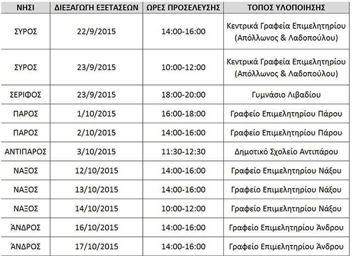 Το Επιμελητήριο ενημερώνει ότι οι εξετάσεις αξιολόγησης των καταρτιζομένων θα διεξαχθούν από τον ΕΦΕΤ στα νησιά της Σύρου, Σερίφου, Πάρου, Αντιπάρου, Νάξου και Άνδρου σύμφωνα με τον παρακάτω πίνακα: