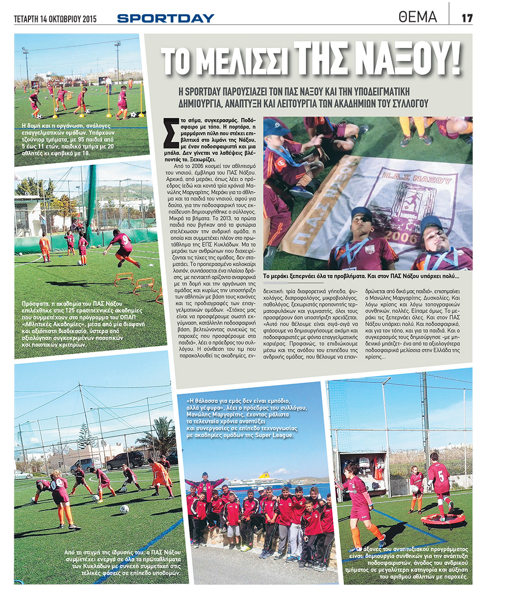 Μεράκι, οργάνωση και επαγγελματισμός θα μπορούσαν να είναι οι λέξεις που χαρακτηρίζουν τον ΠΑΣ Νάξου και τις ακαδημίες του, στις οποίες έκανε εκτενές αφιέρωμα η αθλητική εφημερίδα SPORTDAY.