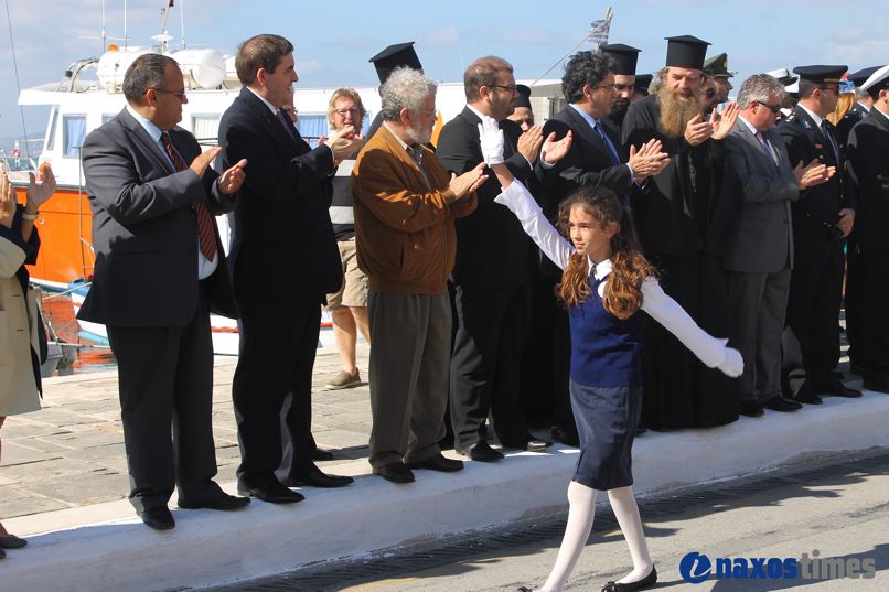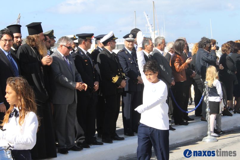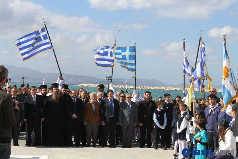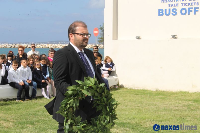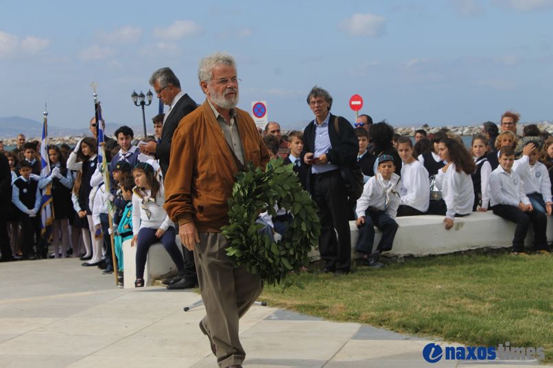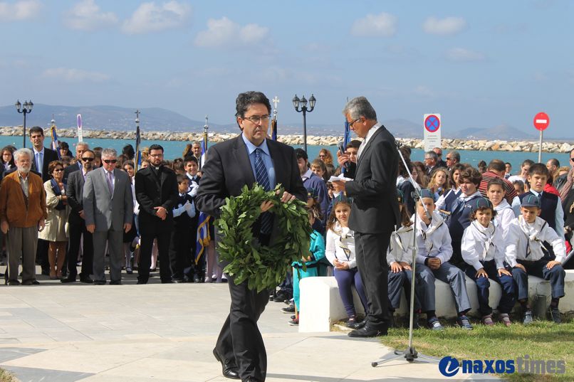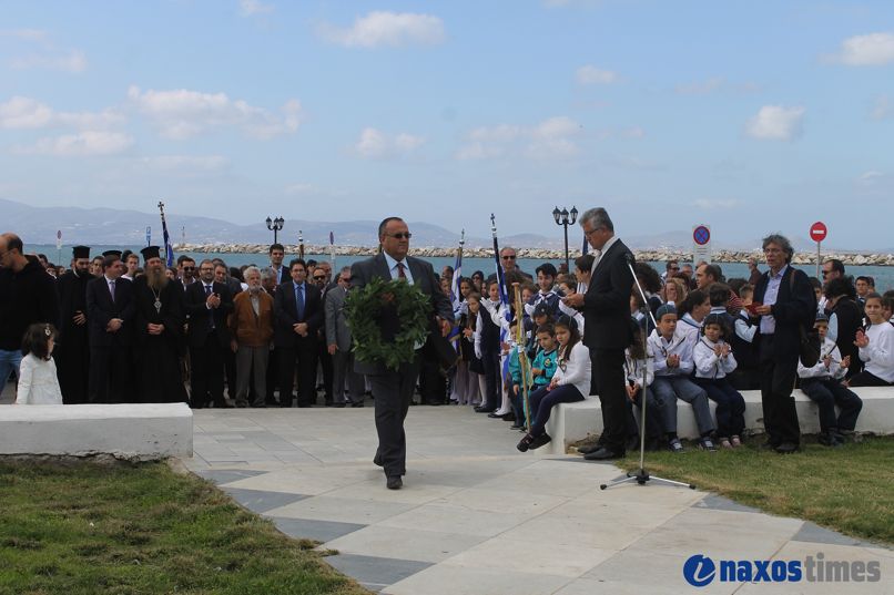 Αμέσως μετά τελέστηκε επιμνημόσυνη δέηση στο μνημείο των Ηρώων της πόλης και ακολούθησε κατάθεση στεφάνων από τους βουλευτή Κυκλάδων Νίκο Μανιό, έπαρχο Νάξου και αντιπεριφερειάρχη Ν. Αιγαίου Γιάννη Μαργαρίτη, δήμαρχο Νάξου και Μικρών Κυκλάδων Μανώλη Μαργαρίτη, Πρόεδρο Δημοτικής Κοινότητας Νάξου Μάκη Μαυρογιάννη, Δ/τη Ναυτικού Παρατηρητηρίου, Δ/τη Τάγματος Εθνοφυλακής, Διοικητή Αστυνομικού Τμήματος Νάξου, Διοικητή Πυροσβεστικού Σώματος, Λιμενάρχη και  Σώμα Ελληνικού Οδηγισμού.