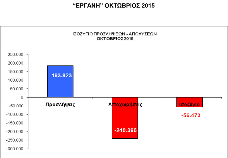 Όπως επιβεβαιώνεται και από τα στοιχεία του συστήματος “ΕΡΓΑΝΗ” του Υπουργείου Εργασίας, τον μήνα Οκτώβριο 2015 έγιναν 183.923 προσλήψεις έναντι 240.396 απολύσεων, με το ισοζύγιο των ροών απασχόλησης να κλείνει για μια ακόμη φορά αρνητικά στις 56.473 χαμένες θέσεις απασχόλησης (σχήμα).