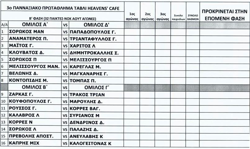 Με πολλές εκπλήξεις , ηχηρούς αποκλεισμούς και περιπετειώδεις προκρίσεις ολοκληρώθηκε η πρώτη φάση του 3ου Πανναξιακού Πρωταθλήματος Τάβλι «HEAVENS CAFÉ»