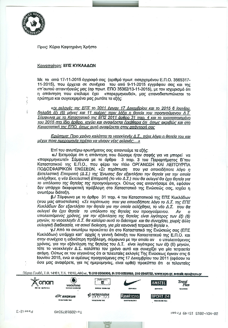 Ο συνδυασμός Καφτηράνη είχε, προ ημερών, ανακοινώσει ότι η ΕΠΟ (με έγγραφο της και απαντώντας στο ερώτημα του επικεφαλής της «ποιο χρόνο καλύπτει το νεοεκλεγέν Δ.Σ., πότε η λήγει η θητεία του και μέχρι ποια ημερομηνία πρέπει να γίνουν νέες εκλογές») αποφάνθηκε ότι η θητεία του τωρινού Δ.Σ. λήγει στις 17 Δεκεμβρίου, ημερομηνία μέχρι την οποία θα πρέπει να γίνουν εκλογές για την ανάδειξη του Διοικητικού Συμβουλίου θα καλύψει την επόμενη τετραετία.