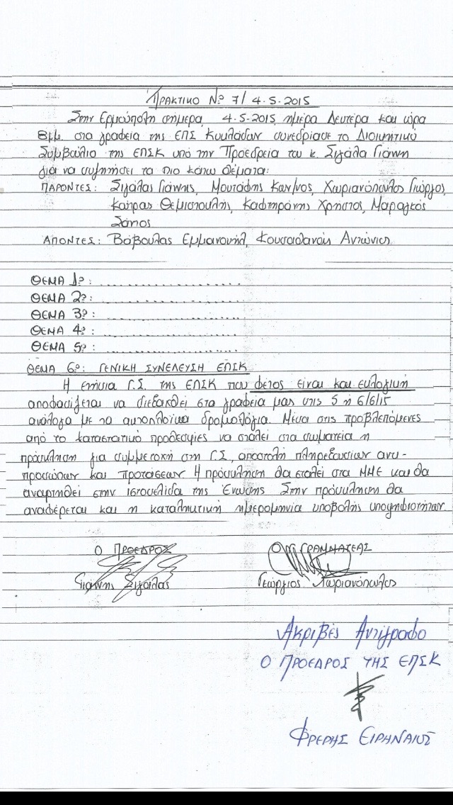 Μετά από αυτό, ο πρόεδρος της ΕΠΣ κ. Φρέρης έδωσε στη δημοσιότητα το πρακτικό του προηγούμενου Δ.Σ., το οποίο (σύμφωνα με την αθλητική ιστοσελίδα syros-sports.gr) φέρει και την υπογραφή του κ. Καφτηράνη και το οποίο αναφέρει πως η ετήσια Γενική Συνέλευση της ΕΠΣ Κυκλάδων είναι και εκλογική και θα διεξαχθεί (όπως και έγινε) στα γραφεία της ΕΠΣ στις 5 ή 6/6/15, ανάλογα με τα ακτοπλοϊκά δρομολόγια.
