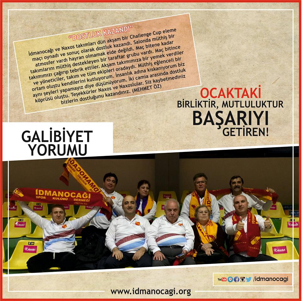 İdmanocağı ve Naxos takımları dün akşam bir Challenge Cup eleme maçı oynadı ve sonuç olarak dostluk kazandı. Salonda müthiş bir atmosfer vardı hayran olmamak elde değildi. Maç bitene kadar takımlarını müthiş destekleyen bir taraftar grubu vardı. Maç bitince takımımızı çağırıp tebrik ettiler. Akşam takımımıza bir yemek verdiler ve yöneticiler, takım ve tüm ekipleri oradaydı. Müthiş eğlenceli bir ortam oluştu kendilerini kutluyorum. İnsanlık adına kıskanıyorum biz aynı şeyleri yapamayız diye düşünüyorum. İki camia arasında dostluk köprüsü oluştu. Teşekkürler Naxos ve Naxoslular. Siz kaybetmediniz bizlerin dostluğunu kazandınız. (MEHMET ÖZ)