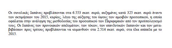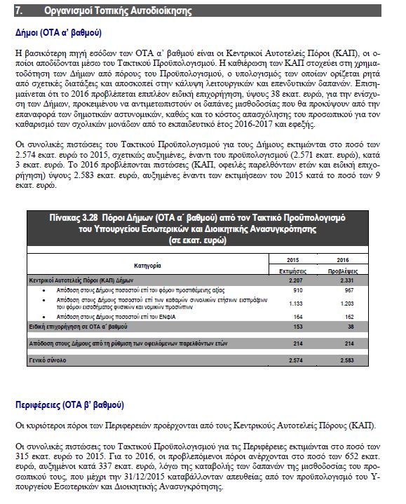 Τα ίδια πάνω κάτω χρήματα από τον προϋπολογισμό θα πάρουν οι δήμοι το 2016 σε σχέση με το 2015, ενώ σημαντικά αυξημένα θα είναι τα κονδύλια των περιφερειών λόγω, όμως, τους ότι μεταφέρεται σε αυτές από τον κρατικό προϋπολογισμό, η αρμοδιότητα μισθοδοσίας των υπαλλήλων τους.