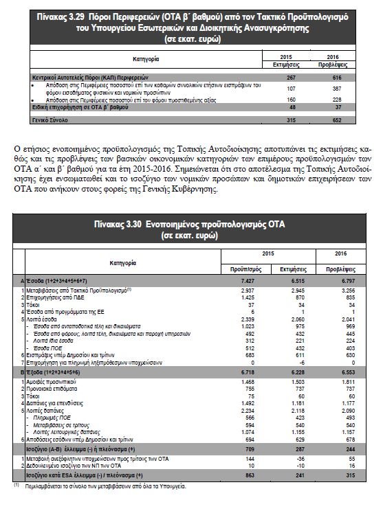 Συγκεκριμένα, όπως προβλέπει ο προϋπολογισμός του 2016 οι δήμοι θα λάβουν 2,583 δισ. ευρώ, 9 εκατ. περισσότερα από τα (εκτιμώμενα) 2,574 δισ. του 2015. Παράλληλα οι περιφέρειες θα πάρουν 652 εκατ. έναντι 315 εκατ. που εκτιμάται ότι θα πάρουν το 2015.