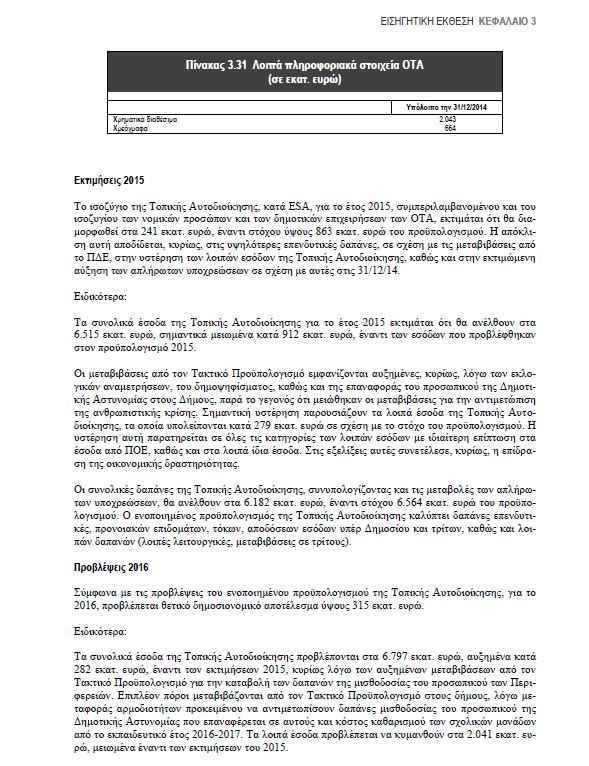 Επιπλέον, σύμφωνα με τον προϋπολογισμό το πλεόνασμα της Αυτοδιοίκησης για το 2015 θα είναι 241 εκατ. ευρώ έναντι στόσου 863 εκατ., ενώ θετικό θα είναι και το ισοζύγιο το 2016 που θα φτάσει τα 315 εκατ. ευρώ. Όσον αφορά τα έσοδα για το 2015 εκτιμάται ότι θα ανέλθουν σε 6,515 δισ. ευρώ, σημαντικά μειωμένα κατά 915 εκατ. ευρώ, έναντι του αρχικού στόχου.