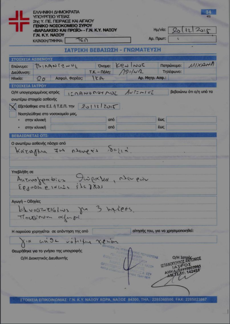 Για του λόγου το αληθές, ο Πανναξιακός παραθέτει την φωτογραφία του Κουφόπουλου, με ράμματα στο επάνω χείλος και την ιατρική γνωμάτευση από το νοσοκομείο Νάξου για τον Βιλαντώνη που έχει κάταγμα στα πλευρά…