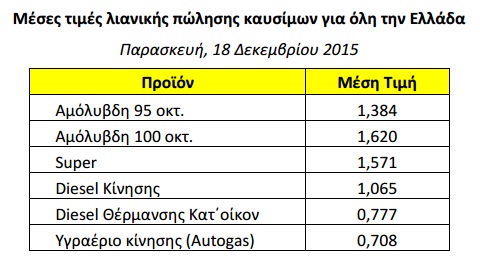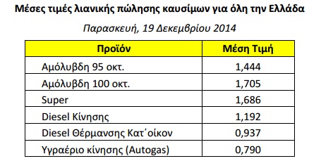 Ένα χρόνο πριν, στις 19/12/2014, πριν η τιμή της απλής αμόλυβδης ήταν στα 1,444 ευρώ το λίτρο και του Diesel στα 1,192 ευρώ το λίτρο.