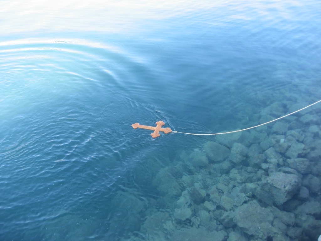Ανήμερα των Φώτων, μετά την λειτουργία των Μεγάλων Ωρών, τελείται ο καθαγιασμός των υδάτων και η ρίψη του Τίμιου Σταυρού. Ο ιερέας ρίχνει το σταυρό μέσα στο νερό -σήμερα ο σταυρός είναι δεμένος πάνω σε σκοινί για να μη χαθεί-, και πιστοί βουτούν για να πιάσουν τον σταυρό, θεωρώντας ύψιστη τιμή, ευλογία και τύχη για όποιον τον βρει και τον πιάσει τον σταυρό. Σχεδόν σε όλα τα μέρη της Ελλάδος κατά τον καθαγιασμό των υδάτων αφήνουν ελεύθερα να πετάξουν τρία λευκά περιστέρια. Τα περιστέρια αυτά συμβολίζουν την Αγία Τριάδα, κατά την φανέρωση του Αγίου Πνεύματος -εν είδη περιστεράς- όταν ο Ιησούς βαφτιζόταν στον Ιορδάνη Ποταμό.