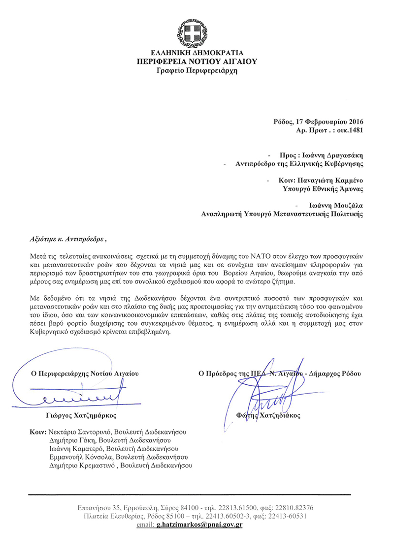 Επίσημη ενημέρωση σχετικά με τη συμμετοχή δύναμης του ΝΑΤΟ στον έλεγχο των προσφυγικών και μεταναστευτικών ροών που δέχονται τα νησιά, μετά και τις ανεπίσημες πληροφορίες περί περιορισμού των δραστηριοτήτων του ΝΑΤΟ στα γεωγραφικά όρια του Βορείου Αιγαίου, ζήτησαν με κοινή επιστολή τους προς τον αντιπρόεδρο της Κυβέρνησης Γιάννη Δραγασάκη ο περιφερειάρχης Ν. Αιγαίου Γιώργος Χατζημάρκος και ο πρόεδρος της Περιφερειακής Ένωσης Δήμων (ΠΕΔ) Νοτίου Αιγαίου και δήμαρχος Ρόδου Φώτης Χατζηδιάκος.