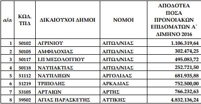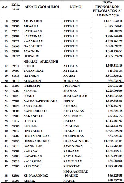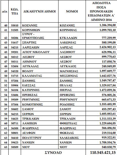 Κατανέμεται, από τον λογαριασμό του Υπουργείου Εσωτερικών & Διοικητικής Ανασυγκρότησης, που τηρείται στο Ταμείο Παρακαταθηκών και Δανείων, με τον τίτλο «Κεντρικοί Αυτοτελείς Πόροι των Δήμων», συνολικό ποσό 110.545.421,15 € στους παρακάτω Δήμους της χώρας.