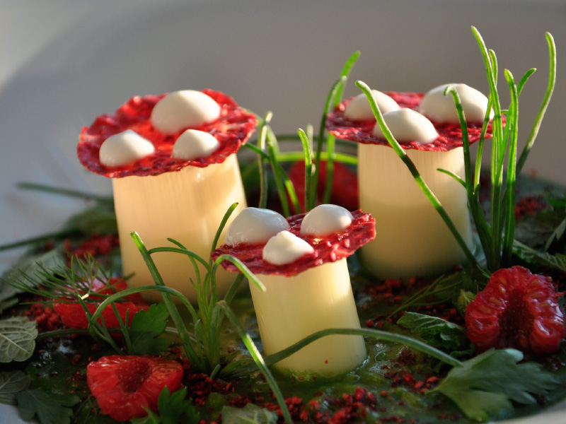Κορυφαίο πιάτο: Κρέμα λευκού μπακλαβά, σάλτσα λευκής σοκολάτας με εστραγκόν και λάιμ, σιρόπι από κόκκινα τριαντάφυλλα, σορμπέ μανταρίνι με τσίλι, παγωτό μαύρο σουσάμι.