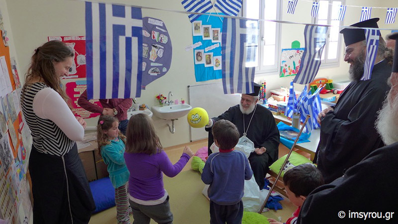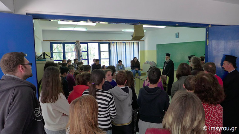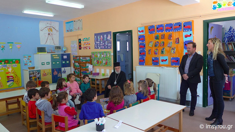 Συνοδευόμενος από τον Αρχιερατικό Επίτροπο Κύθνου, Πρωτοπρ. Κωνστ. Γονίδη, και τους ιερείς της Κύθνου, τον δήμαρχο Κύθνου κ. Σταμάτη Γαρδέρη, τον πρόεδρο του Δημοτικού Συμβουλίου κ. Κ. Φιλιππαίο, τους τοπικούς παρέδρους και τον έπαρχο Κέας – Κύθνου κ. Παναγιώτη Βιτάλη, επισκέφθηκε το Γυμνάσιο Κύθνου (το Λύκειο απουσιάζει σε εκδρομή στο Βόλο), τα Δημοτικά Σχολεία Δρυοπίδος και Χώρας και τους Παιδικούς Σταθμούς Δρυπίδος και Χώρας, στους μαθητές των οποίων μίλησε και διένειμε δώρα και ευλογίες, ενώ συνεχάρη τους εκπαιδευτικούς για το έργο τους.