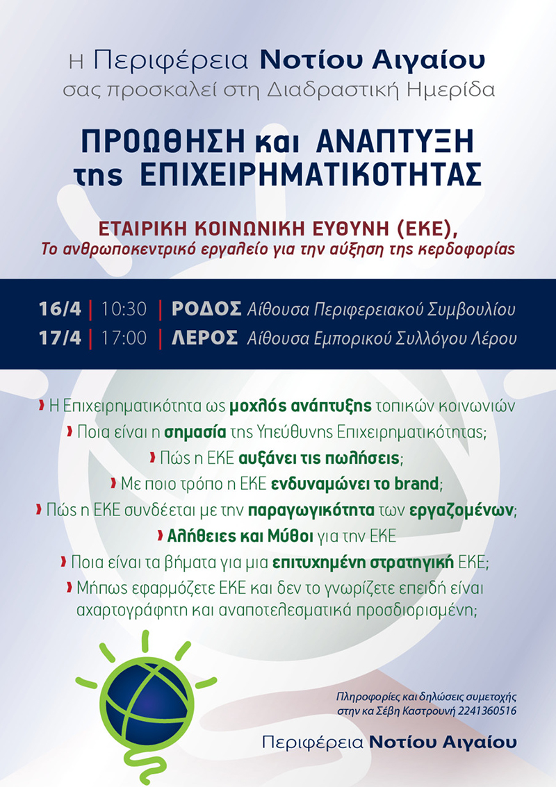 Στην διαδραστική ημερίδα με θέμα «Προώθηση και Ανάπτυξη της Επιχειρηματικότητας: Εταιρική Κοινωνική Ευθύνη (ΕΚΕ), το ανθρωποκεντρικό εργαλείο για την αύξηση της κερδοφορίας» καλεί τα μέλη του ο Σύνδεσμος Νέων Επιχειρηματιών Νοτίου Αιγαίου (ΕΣΥΝΕΝΑ).