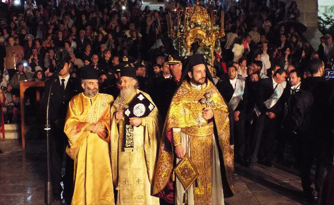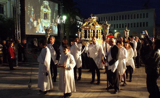 Νωρίτερα, είχε πραγματοποιηθεί η περιφορά του Επιταφίου του Ιερού Καθολικού Ναού της Ευαγγελίστριας, την οποία συνόδευε η μικτή χορωδία της ενορίας και πλήθος πιστών.