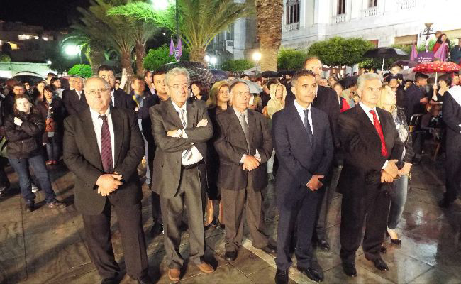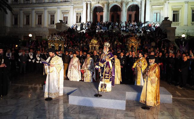 Η χορωδία του Αγίου Νικολάου απέδωσε θρησκευτικούς ύμνους, ενώ η Φιλαρμονική του Δήμου έπαιζε πένθιμα εμβατήρια. Ακολούθησε δέηση από τον Μητροπολίτη Σύρου κ. Δωρόθεο Β, ο οποίος στον χαιρετισμό του προς τους συγκεντρωμένους πιστούς απηύθυνε μήνυμα αγάπης, ελπίδας και προσευχής.