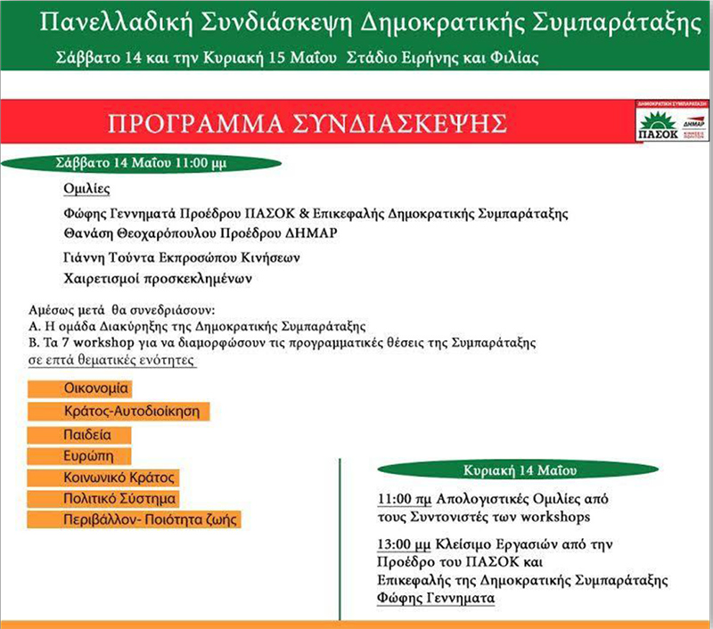 Ωστόσο, η Δημοκρατική Συμπαράταξη (ΠΑΣΟΚ-ΔΗΜ.ΑΡ.-Κινήσεις Πολιτών) καλεί τις Κυκλαδίτισσες και τους Κυκλαδίτες να συμμετέχουν ενεργά στο διάλογο που ξεκίνησε στην ηλεκτρονική διεύθυνση www.dsymparataxi.gr, όπου έχουν αναρτηθεί όλα τα κείμενα διαλόγου ενόψει της Συνδιάσκεψης της που θα πραγματοποιηθεί στις 14 και 15 Μαΐου, αναρτώντας τα σχόλιά τους στις σχετικές ενότητες που παρουσιάζονται αυτές.