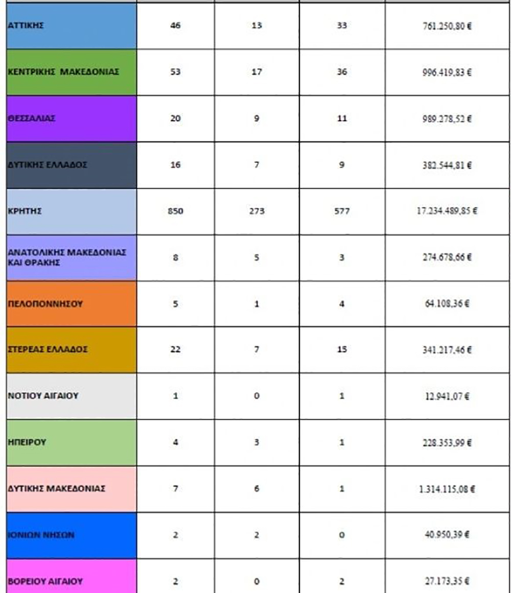 Στον παρακάτω πίνακα φαίνονται τα αποτελέσματα, με την Κρήτη να είναι πρώτη στα παράνομα ΑΦΜ (850), με 273 άτομα να έχουν λάβει άνω των 20.000 ευρώ επιδότηση και 577 κάτω των 20.000 ευρώ με το ποσό να φτάνει τα 17. 234.489 εκατ. ευρώ.