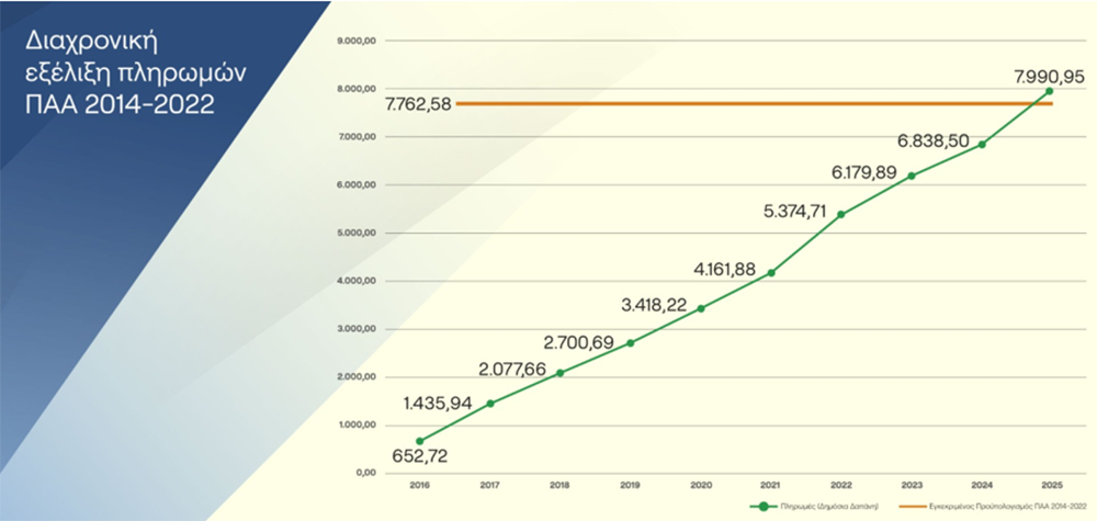 Το σύνολο των πληρωμών και από τα δύο προγράμματα, ΠΑΑ και ΣΣ ΚΑΠ, ανήλθαν εντός του 2025 σε 1.447,64 εκ. €, το οποίο είναι και το μεγαλύτερο ποσό που έχει πληρωθεί σε δράσεις του Πυλώνα ΙΙ της ΚΑΠ εντός του ίδιου έτους εφαρμογής της.
