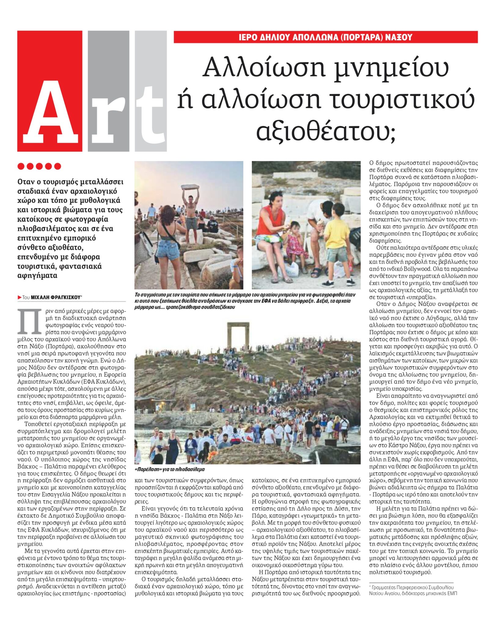 Πριν μερικές μέρες με αφορμή τη διαδικτυακή ανάρτηση φωτογραφίας ενός νεαρού τουρίστα που ανυψώνει μαρμάρινο μέλος του αρχαϊκού ναού του Απόλλωνα στη Νάξο (Πορτάρα), ακολούθησαν στο νησί μια σειρά πρωτοφανή γεγονότα, που απασχόλησαν την κοινή γνώμη.