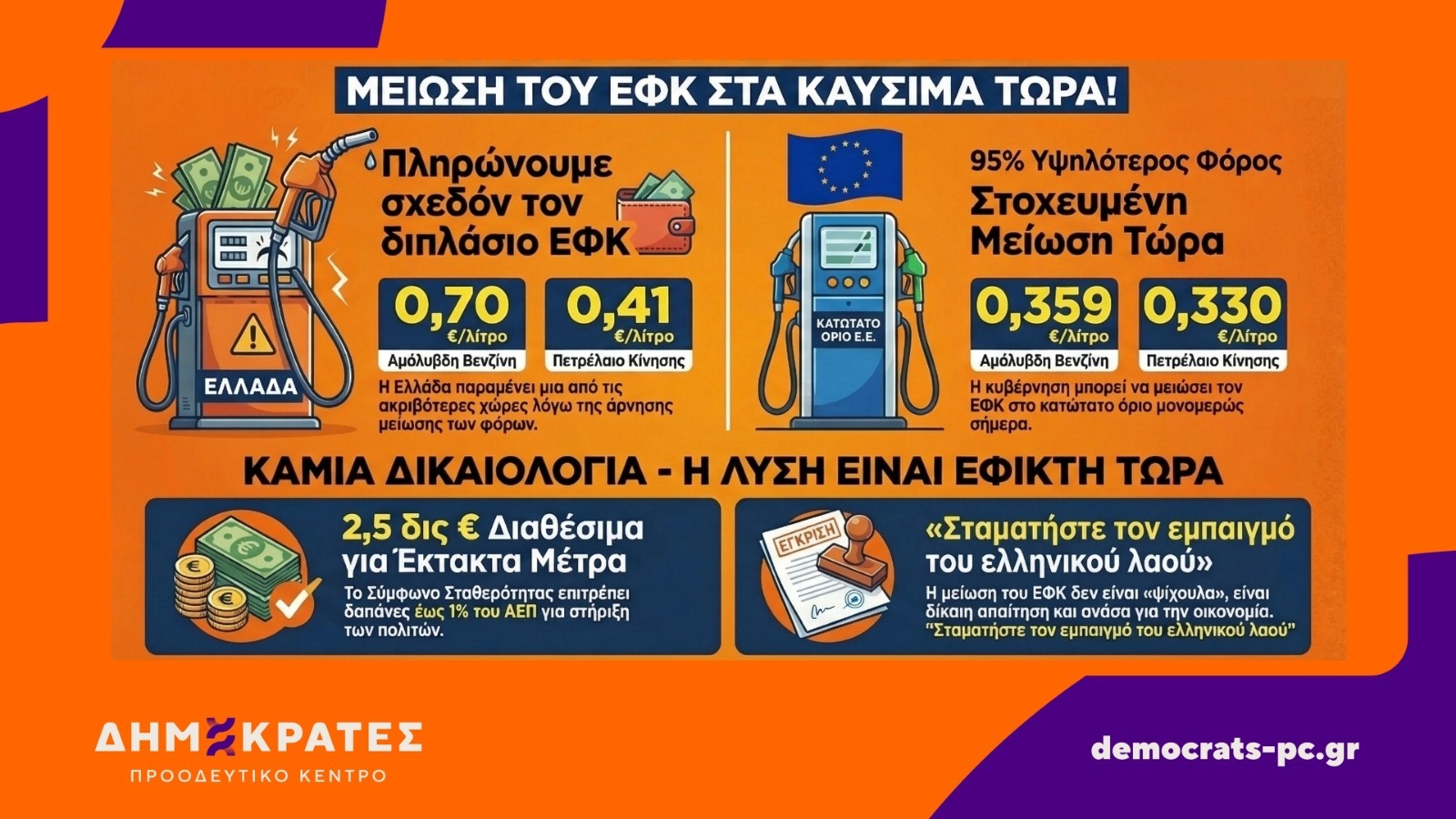 Μείωση του ΦΠΑ από 24% σε 6% και ταυτόχρονη μείωση του ΕΦΚ (από 0,41 σε 0,21 €/λίτρο), ώστε να στηριχθεί η παραγωγή και να μειωθεί το κόστος σε όλη την εφοδιαστική αλυσίδα — ιδιαίτερα στα νησιά.