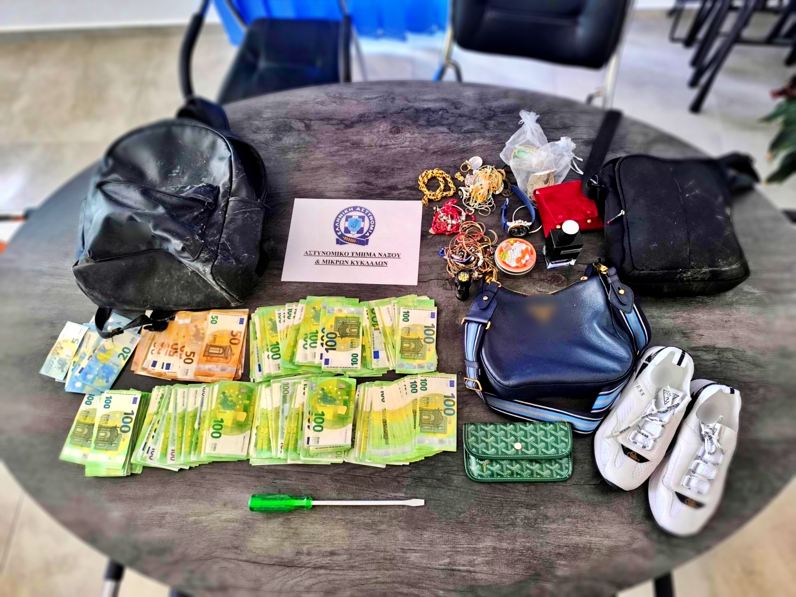 Στην κατοχή του βρέθηκαν κατσαβίδι, σακίδιο πλάτης και τσαντάκι ώμου με χρήματα, κοσμήματα, υποδήματα και γυναικείες τσάντες, που είχαν αφαιρεθεί λίγη ώρα νωρίτερα από τουριστικά καταλύματα.