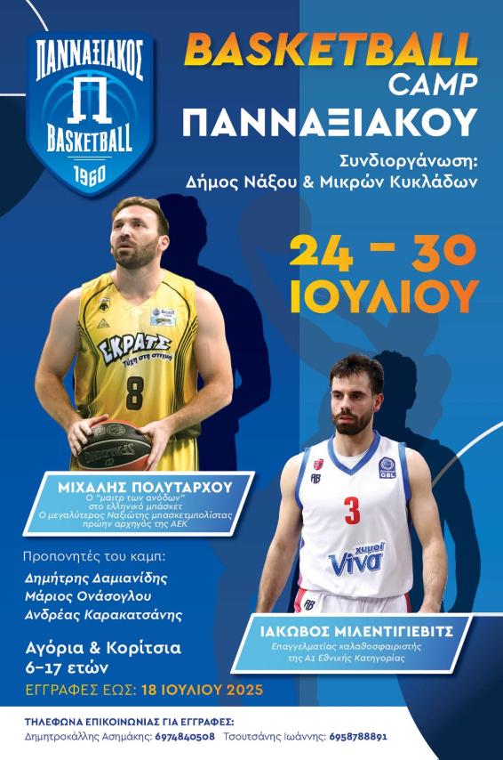 Μια μοναδική μπασκετική εμπειρία περιμένει αγόρια και κορίτσια ηλικίας 6 έως 17 ετών στη Νάξο, από τις 24 έως τις 30 Ιουλίου 2025, στο Καλοκαιρινό Basketball Camp που διοργανώνει ο Πανναξιακός Basketball σε συνδιοργάνωση με τον Δήμο Νάξου και Μικρών Κυκλάδων.