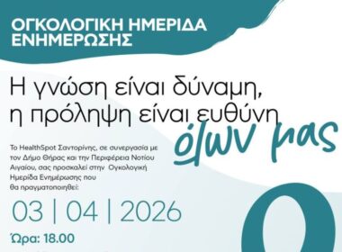 Το HealthSpot Σαντορίνης, σε συνεργασία με τον Δήμο Θήρας και την Περιφέρεια Νοτίου Αιγαίου, σας προσκαλεί στην Ογκολογική Ημερίδα Ενημέρωσης