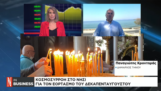 Ο Δήμαρχος Τήνου, Παναγιώτης Κροντηράς, μιλώντας στο κανάλι της «Ν», αναφέρθηκε στον εορτασμό του Δεκαπενταύγουστου, την αυξημένη επισκεψιμότητα, τις πιέσεις