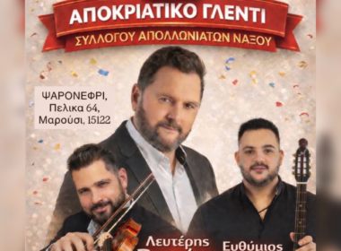 O Σύλλογος Απολλωνιατών Νάξου με χαρά σας προσκαλεί στο αποκριάτικο γλέντι την Κυριακή 15 Φεβρουαρίου 2026, στις 14:00, στο μεζεδοπωλείο