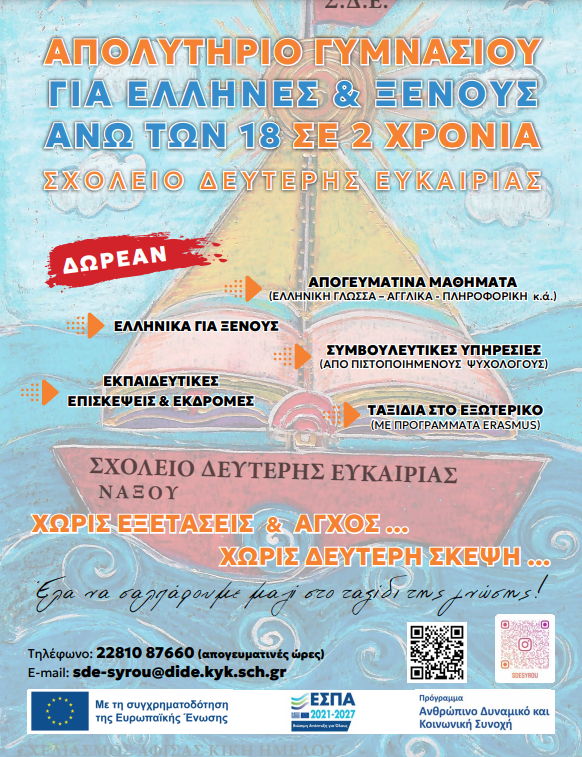 Συνεχίζονται οι εγγραφές στο Σχολείο Δεύτερης Ευκαιρίας (Σ.Δ.Ε.) για το σχολικό έτος 2025-26, που λειτουργεί στις Κυκλάδες με έδρα τη Σύρο και τμήματα στη Νάξο και τη Σαντορίνη. Το Σ.Δ.Ε. προσφέρει σε ενήλικες που δεν έχουν ολοκληρώσει την υποχρεωτική εκπαίδευση τη δυνατότητα να αποκτήσουν, μέσα σε δύο χρόνια, απολυτήριο Γυμνασίου, με δωρεάν φοίτηση και σύγχρονο πρόγραμμα μαθημάτων.