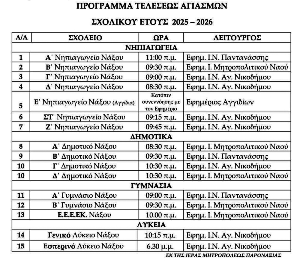 Στη Νάξο, η Ιερά Μητρόπολη Παροναξίας ανακοίνωσε το πρόγραμμα τελέσεως Αγιασμών για Νηπιαγωγεία, Δημοτικά, Γυμνάσια και Λύκεια.