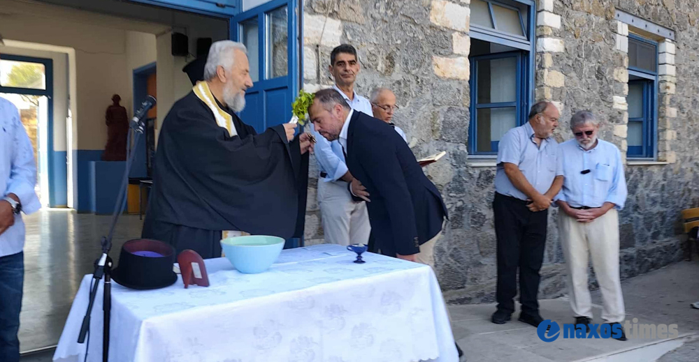 Ο αγιασμός στο 2ο Γυμνάσιο Χώρας Νάξου, παρουσία μαθητών, εκπαιδευτικών και τοπικών αρχών.
