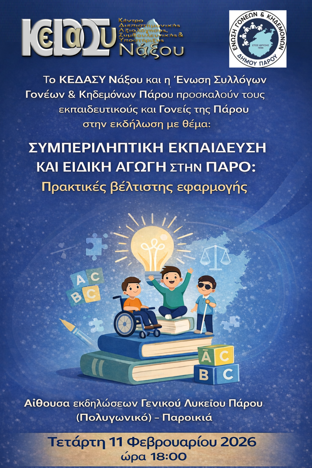 Η εκδήλωση θα πραγματοποιηθεί την Τετάρτη 11/2/2026 στις 18.00, στην αίθουσα εκδηλώσεων (Πολυγωνικό) του Γενικού Λυκείου Πάρου.