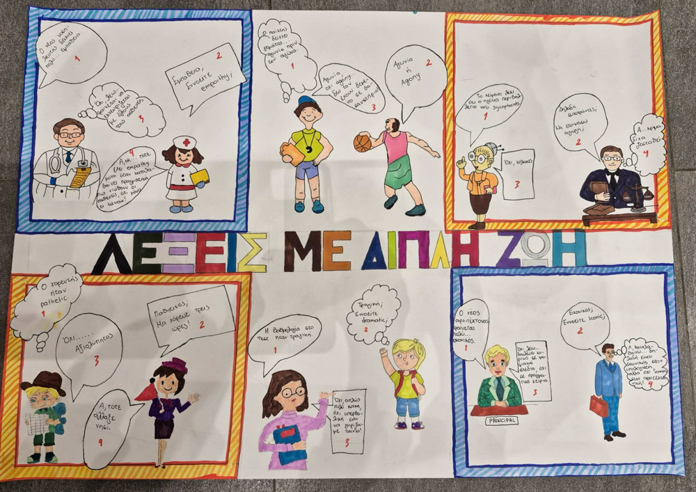 Οι μαθήτριες παρουσίασαν μια ιδιαίτερα πρωτότυπη αφίσα, την οποία δημιούργησαν οι ίδιες, με τίτλο «Λέξεις με διπλή ζωή». Στο πλαίσιο της δράσης, σχεδίασαν έξι μικρά κόμικ, μέσα από τα οποία ανέδειξαν με ευρηματικό και χιουμοριστικό τρόπο τα λεγόμενα ψευδόφιλα ζεύγη λέξεων.