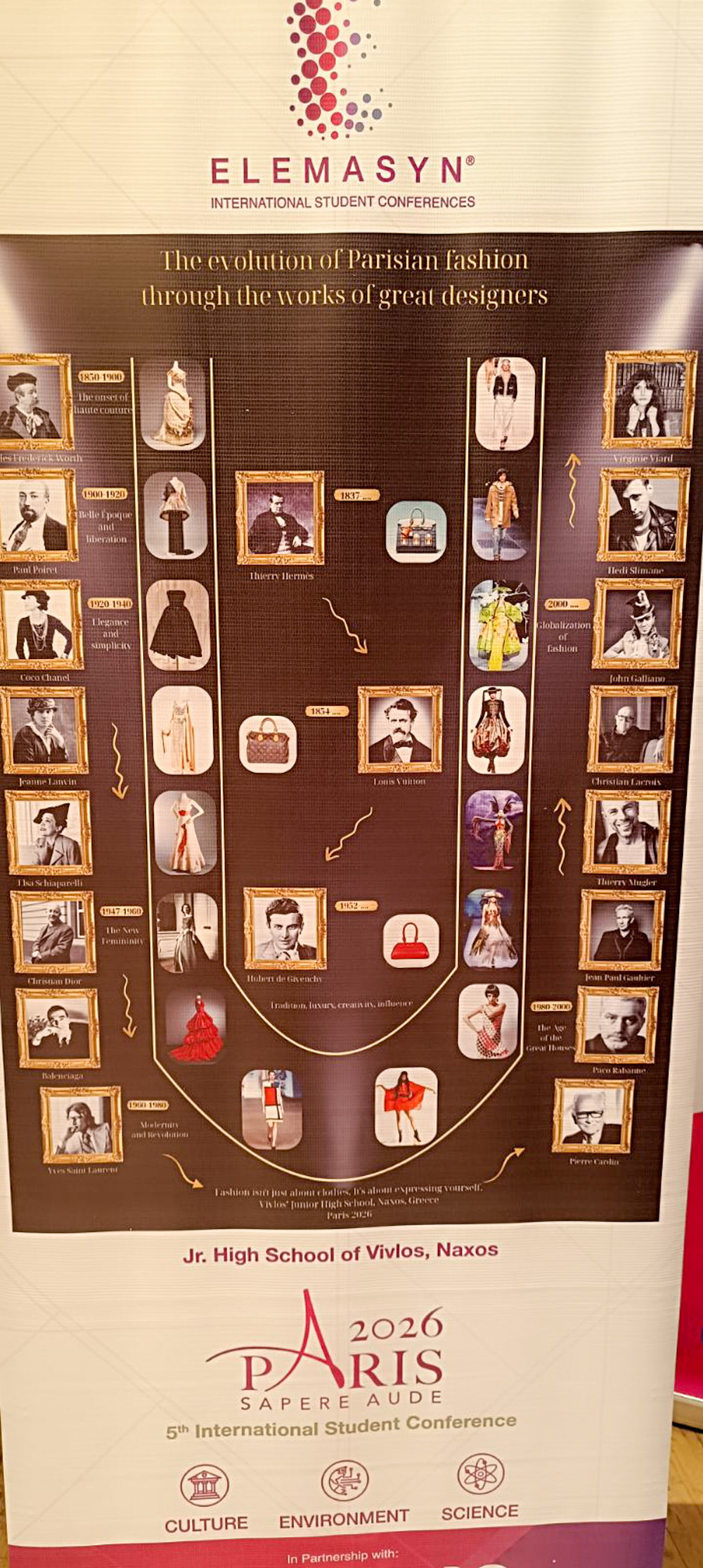 Μέσα από την έρευνα και την παρουσίασή τους, οι μαθητές ανέδειξαν σημαντικούς σταθμούς στην ιστορία της παρισινής μόδας, εξετάζοντας το έργο εμβληματικών σχεδιαστών που επηρέασαν την παγκόσμια αισθητική και διαμόρφωσαν τις τάσεις της κάθε εποχής. Η εργασία τους αποτέλεσε μια δημιουργική προσέγγιση της σχέσης μεταξύ πολιτισμού, τέχνης και κοινωνίας, προσεγγίζοντας τη μόδα ως μορφή έκφρασης και ιστορικής καταγραφής.