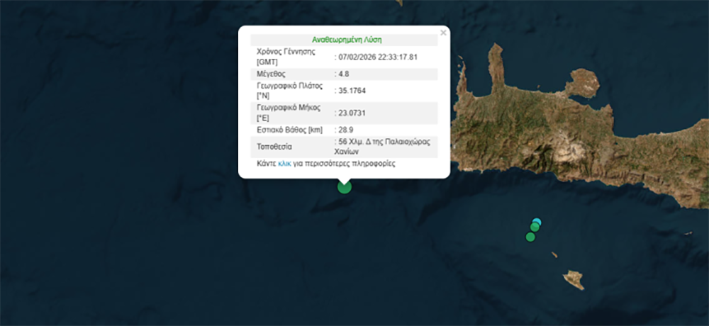 Ισχυρή σεισμική δόνηση 4,8 βαθμών της κλίμακας Ρίχτερ σημειώθηκε μετά τα μεσάνυχτα του Σαββάτου (07/02) στα ανοιχτά της Κρήτης και δυτικά της Παλαιοχώρας Χανίων.