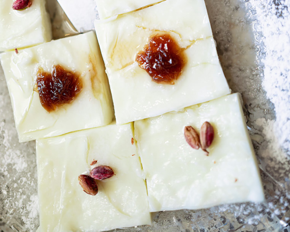 Βγάζουμε το ταψάκι από το ψυγείο και κόβουμε το μαλεμπί σε τετράγωνα κομμάτια.