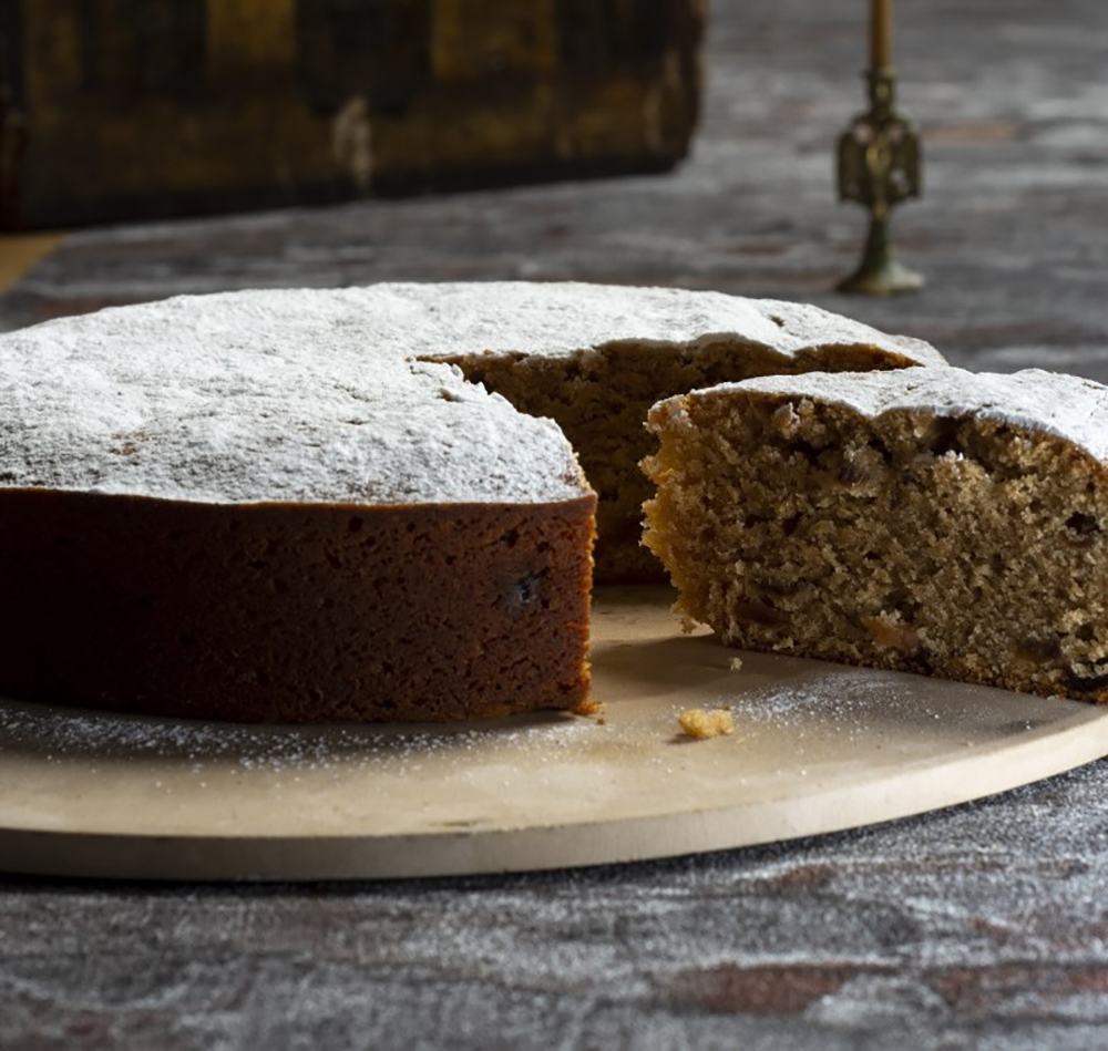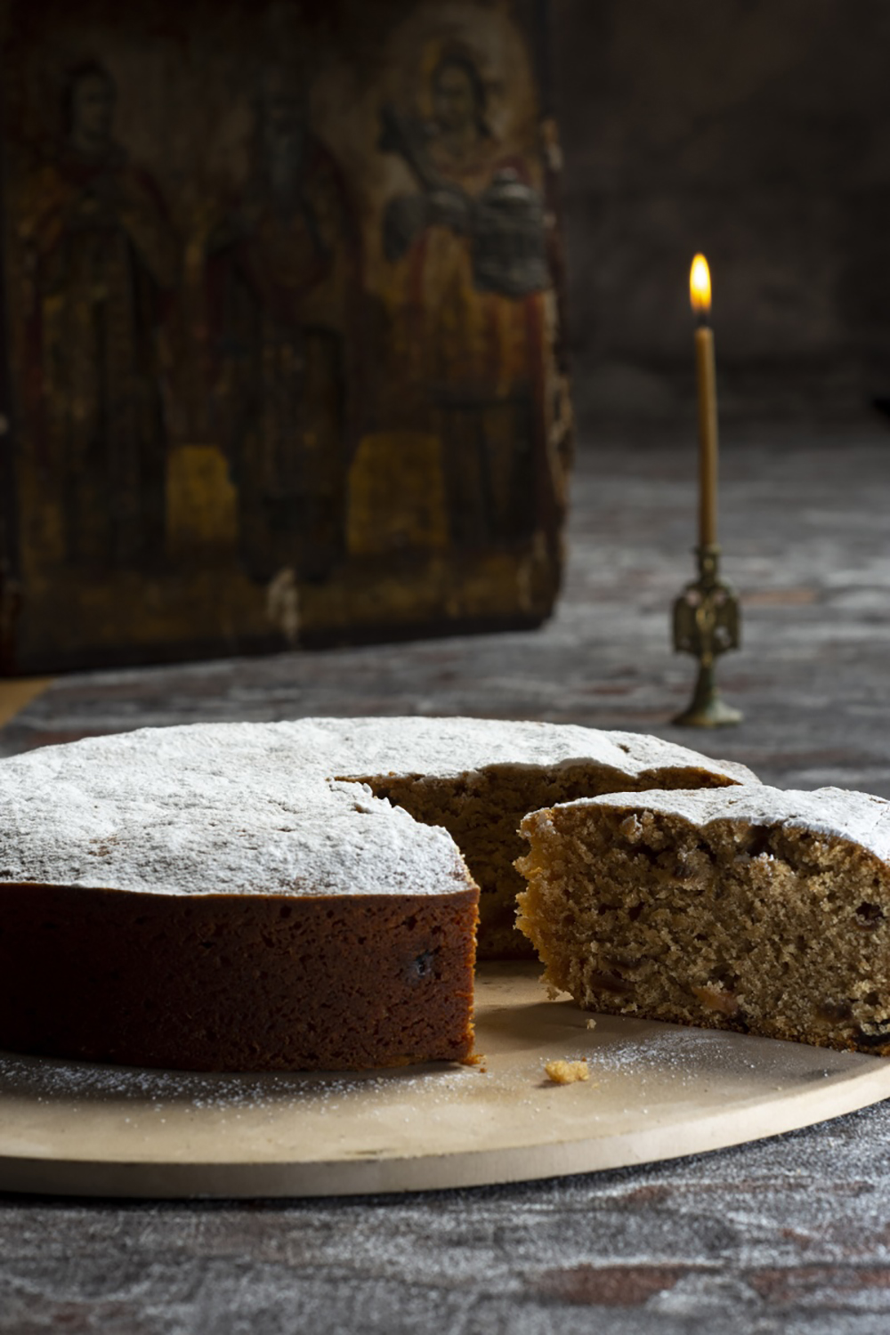 Σε ένα μεγάλο μπολ ρίχνουμε το ελαιόλαδο, τον χυμό πορτοκαλιού και κατόπιν τα υπόλοιπα υλικά μαζί. Ανακατεύουμε με το χέρι και τοποθετούμε σε ένα ταψί λαδωμένο και αλευρωμένο, διαμέτρου 24 εκ. Ψήνουμε στους 160°C, στον αέρα, για 45-50 λεπτά. Βγάζουμε από το ταψί, αφήνουμε να κρυώσει και πασπαλίζουμε με ζάχαρη άχνη.